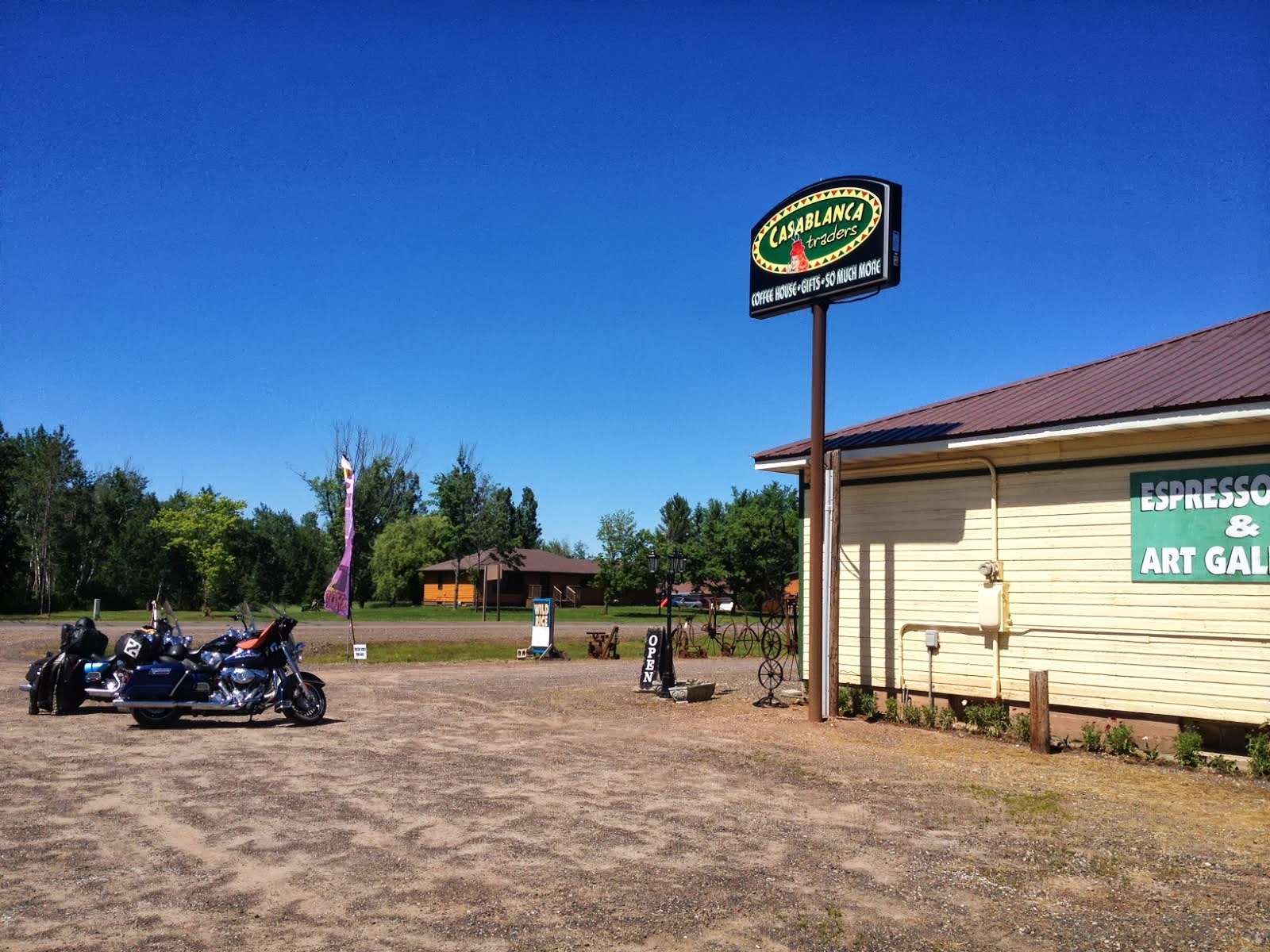 Kjapp stopp for en benstrekk og kaffe. Kjørte fra Duluth litt sent i dag, kneet mitt er ikke helt i form stakkars. Men kjøringen går utmerket – det er det å komme seg av og på sykkelen som er tricky ! 🙂