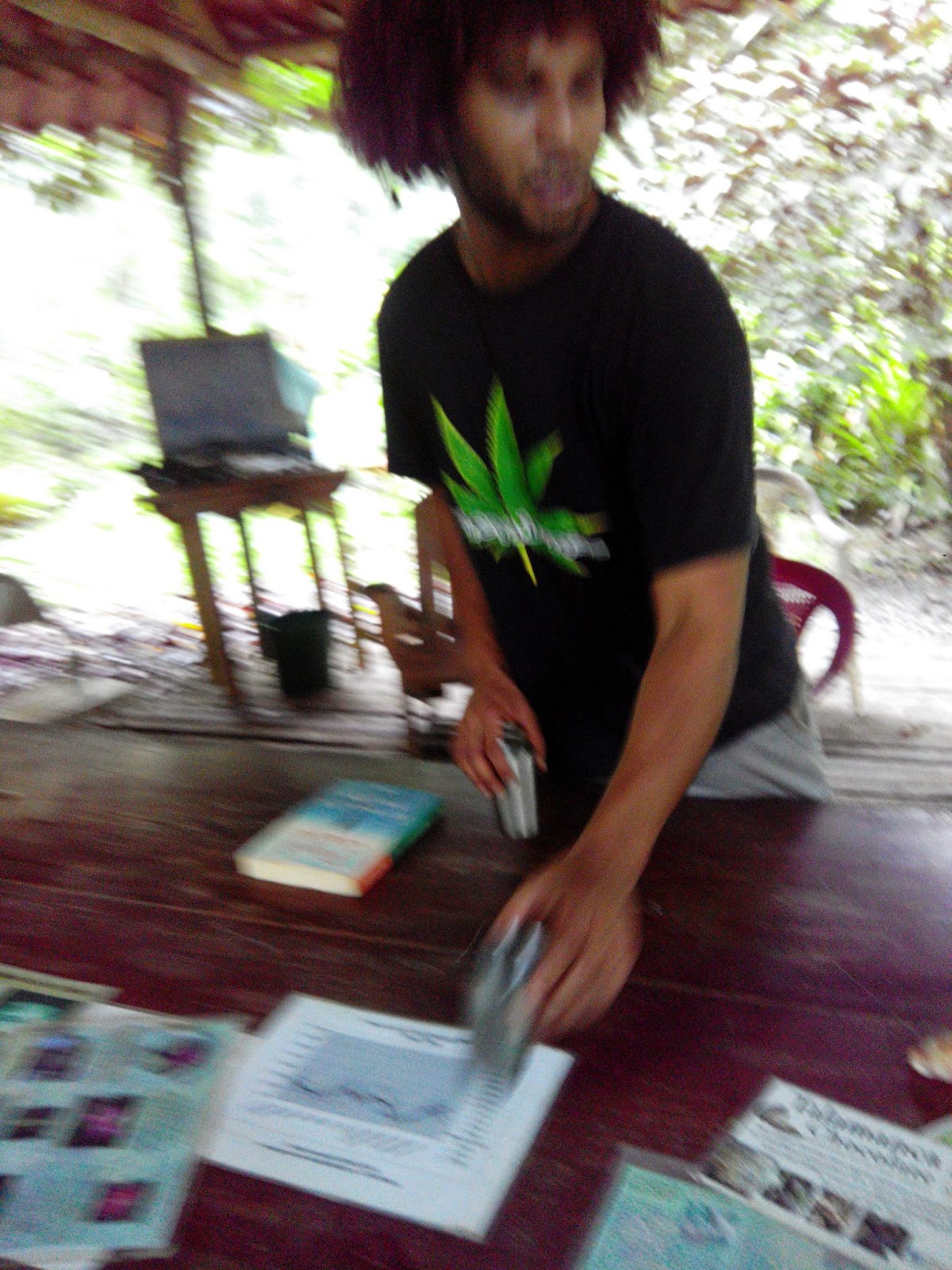 På slutten av turen møtte vi mr mariuhana igjen. Han fortalte å viste litt, vi fikk smake juice fra en opprinnelig brasiliansk frukt.. Aldri smakt før, skikkelig gøtt. Så kom han med det jeg med en gang mente var en klump hasj til hver av oss. Men han mente da fast bestemt at dette var sjokolade som var laget hos dem…smakte forsåvidt også sjokkis. 🙂